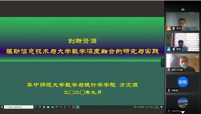 10月31日上午,华中师范大学数学与统计学学院方文波教授应教务处及数理学院邀请,通过线上方式,为我校教师作了题为“创新资源驱动信息技术与大学数学深度融合的研究与实践”的报告。数理学院副院长黄华主持报告会,数理学院42名教师聆听了讲座。