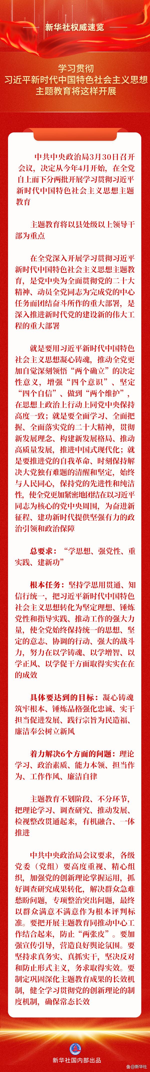 中共中央政治局3月30日召开会议,决定从今年4月开始,在全党自上而下分两批开展学习贯彻习近平新时代中国特色社会主义思想主题教育。 这次主题教育的总要求、根本任务是什么,具体要达到怎样的目标,一起来学习。