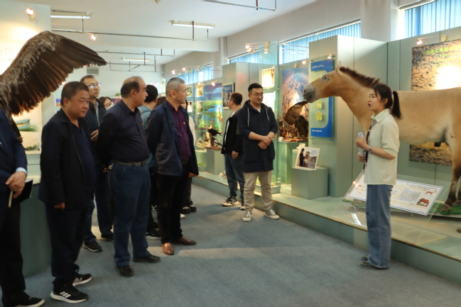 新疆农业大学动物标本馆是集教学实习、科学研究、科普教育、标本制作与储藏功能为一体的大型生态标本馆,是研究新疆动物资源,认识生物多样性和生态保护教育的重要基地。进入标本馆,讲解员对新疆特有荒漠动物区的普氏野马、赤狐,森林动物区的野猪、长耳鸮,山地动物区的雪豹,绿洲鸟类标本区的苍鹰进行了详细讲解。