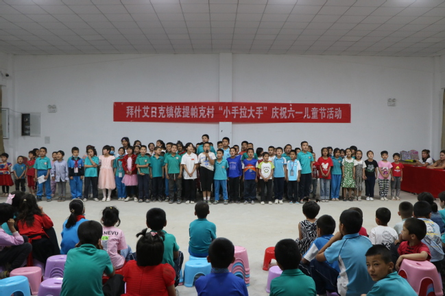在依提帕克村开展的“小手拉大手——庆祝六一儿童节”文艺汇演中,小朋友们表演的话剧《狼来了》、诗朗诵《中国少年》等一个个精彩的节目使整个村委会变成了歌声和欢笑的海洋。