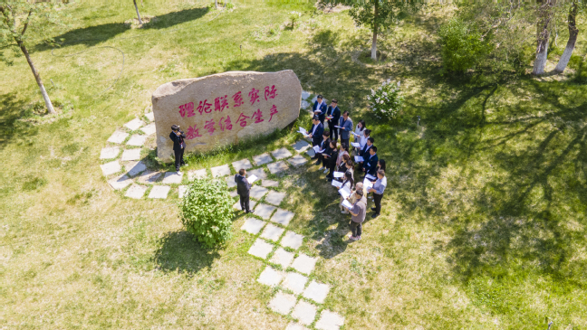 在办学方针文化石前,高志涛说:“屯垦戍边办大学,稳疆兴疆育人才”既是农大的办学宗旨,也是党对新疆高校的要求。建校70年来,农大始终坚守屯垦戍边的初心,牢记为党育人,为国育才的使命,培养了一代代农大人立足新疆,服务“三农”,为屯垦戍边和边疆农业发展服务,为自治区经济社会发展做出了重要贡献。“农大人游农大”研学实践活动带领大家重温学校办学历史,更加坚定我们用习近平新时代中国特色社会主义思想铸魂育人,努力办好人民满意的教育,推动教育高质量发展的信心和决心。
