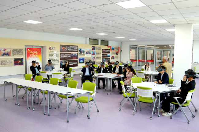 离开校史馆,全体党员来到研学实践最后一个点位——新疆农业大学思想政治理论课融媒体体验中心。该中心位于图书馆三楼,2021年建成使用,旨在运用新媒体新技术致力于打造一个集备课资源、教学辅助、无纸化考试、实践教学、教师研修以及学术资源于一体的智慧型思政中心,推动学校思政课改革创新。