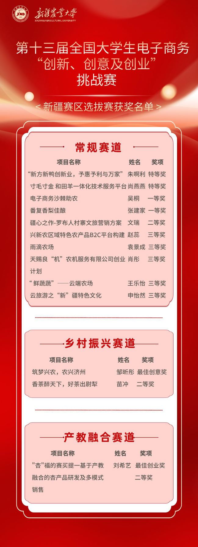 6月3-4日,第十三届全国大学生电子商务“创新、创意及创业”挑战赛新疆赛区选拔赛在新疆大学举行。我校参赛队与包括新疆大学、石河子大学和中国石油大学(北京)克拉玛依校区在内的16所高校百余支参赛队伍同台竞技。经过激烈角逐,我校学子获得特等奖2项、一等奖2项、二等奖3项、三等奖5项、最佳创业奖1项、最佳创意奖1项的佳绩,获奖数创历史之最。因入围区赛数和获奖数位居全疆院校前列,我校荣获优秀组织奖!