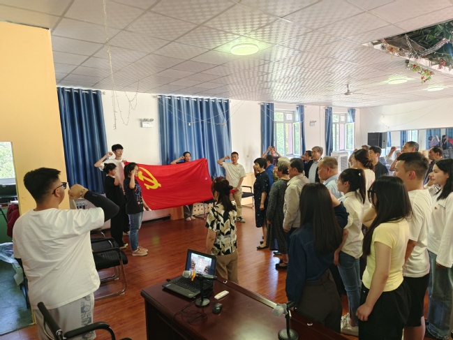 在场离退休党员为学生党员佩戴党徽,勉励同学们珍惜荣誉,秉承老一辈农大人自力更生、艰苦奋斗的精神,传承红色血脉,争当合格的接班人。随后学生党员为离退休党员献花并以表崇高敬意。在庄严肃穆的氛围中,全体师生党员共同重温入党誓词,铮铮誓言、铿锵洪亮。