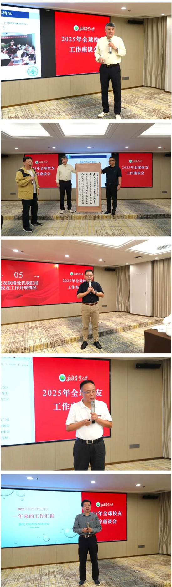 在主题发言环节,广东联络处、生物812级校友崔大方分享以“三服务”为核心,助推母校科研发展的经验做法,广东校友联络处、水利77级校友王毅赠送了专门为此次大会创作的诗词书法作品;四川联络处、动医96级校友莫广分享以“传承致远”为理念,以老一辈农大人的奋斗精神激励年轻校友接续前行的感人故事;陕西联络处86级校友李斌分享用“文化聚心”凝聚校友,依托文化活动凝聚校友情感的工作经验;乌鲁木齐联络处、农学86级校友蔡刚分享以“产学研联动”为抓手,助推校企合作的探索历程。