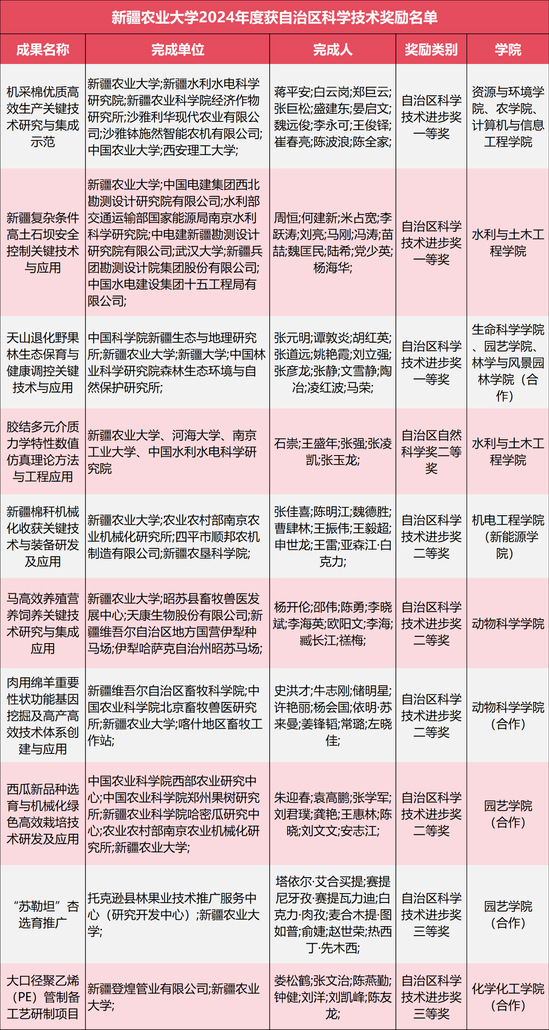 近日,自治区人民政府发布《新疆维吾尔自治区人民政府关于奖励2024年度自治区科学技术突出贡献奖获奖人员和自治区科学技术奖获奖科技成果的决定》,新疆农业大学共有10项科技成果荣获自治区科学技术奖。其中,一等奖3项(主持2项,合作1项)、二等奖5项(主持3项,合作2项)、三等奖2项(合作)。