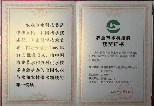 11月8日,第十届农业节水科技奖颁奖大会在广东省广州市举行,新疆农业大学教授王振华被授予2024-2025年度(第十届)中国农业节水科技奖个人成就奖(科技人才奖)。我校水利与土木工程学院马亮、洪明等联合校外单位申报的成果“南疆粮果蔬节水提质增效关键技术研究与应用”,荣获科技成果奖二等奖。