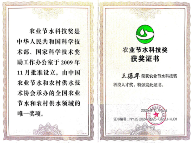 中国农业节水科技奖是由国家科学技术部、国家科学技术奖励办公室于2009年11月25日批准设定,由中国农业节水和农村供水协会承办的全国农业节水和农村供水领域的最高奖项和唯一奖项。本届中国农业节水科技奖表彰奖励包括科技成果奖49项、个人成就奖10人(其中科技人才奖3人、管理人才奖2人、青年人才奖5人),王振华教授因在“干旱区节水灌溉理论技术与关键装备”领域的杰出贡献被授予该奖项,系西北地区本年度唯一获此殊荣的科技工作者。