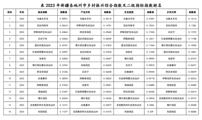 近日,新疆乡村振兴发展指数(第二期)由新疆农业大学乡村振兴研究院正式发布。在遵循科学性、可行性、可测性和数据可获得性原则基础上,该指数以“到2035年基本实现农村现代化”为目标值,在考虑了指标的可量化性以及数据的可获得性的基础上,从产业兴旺、生态宜居、乡风文明、治理有效和生活富裕五个维度构建新疆乡村振兴综合指标体系,涵盖了农业劳动生产率、供水总量、绿化覆盖面积等19个具体指标,将更加全面评价新疆各地州在农村生产、农业发展、人居环境以及乡风建设等领域的发展水平,进而揭示新疆乡村振兴战略整体实施水平。