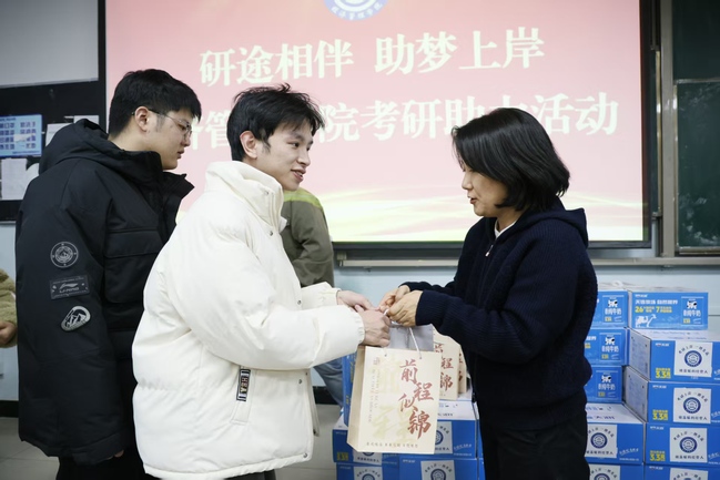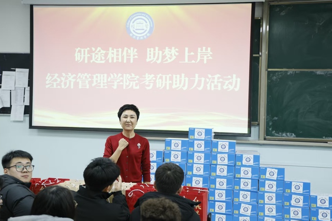 2026年研究生招生考试倒计时之际,经济管理学院开展“研途相伴 助梦上岸”考研慰问活动。明德书院院长兼学院学工办主任加依娜·米拉提汗,毕业班班主任老师代表汪晶晶、陈丽,为备考学子送去关怀与鼓励。