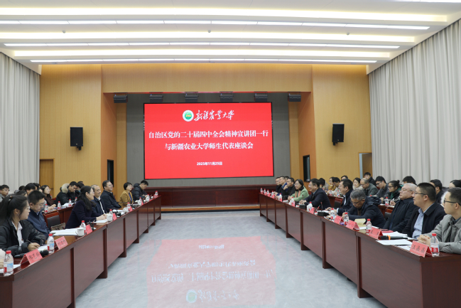 11月24日下午,自治区党的二十届四中全会精神宣讲团一行与新疆农业大学师生代表座谈会在畜牧楼一楼学术会议厅举行。自治区宣讲团成员、自治区科技厅党组书记、副厅长王成及自治区科技厅副厅长邱旭生、自治区教育厅副厅长李建荣一行出席会议。校党委书记谢树青,党委副书记、校长郑文新及师生代表参与座谈。会议由谢树青主持。