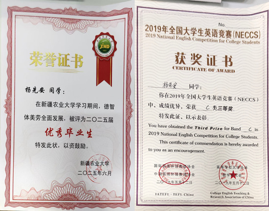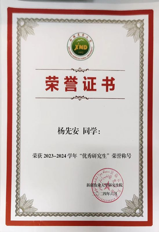 他是杨先安,新疆农业大学2025级园艺学博士研究生。2018年本科入学林学与风景园林学院,2022年保研为本校硕士研究生。在学期间,斩获各级奖学金5项,仅硕士研究生期间获各类荣誉14项,展现出优异的学术能力,一作发表SCI论文2篇,其中1篇发表于中国科学院二区期刊。