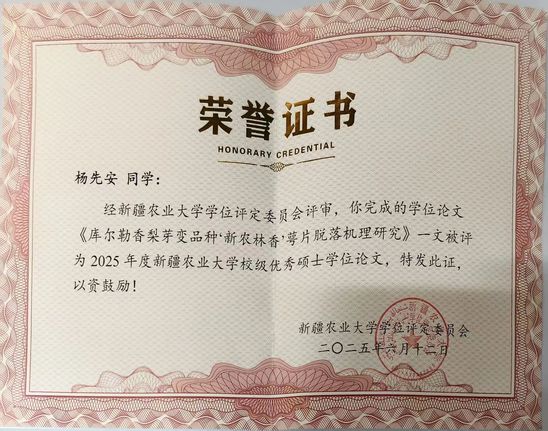 杨先安牢记习近平总书记的指示,“要加大良种、良机、良法的推广力度” ,把实验室“搬”到了田间地头。硕士研究生期间,他与张翠芳教授的团队聚焦库尔勒香梨萼片脱落机理,顶着烈日反复观察实验,最终发现一株罕见的香梨芽变材料。2013年-2022年,这个团队历经10年,几代成员对这个芽变材料的物候期,生物学特性进行调查,先后有4位研究生和13名本科生参与了香梨育种试验,他也是其中的一员。2023年芽变材料,成功通过自治区林木良种审定委员会审定,新品种被命名为“新农林香”。脱萼率提高促进库尔勒香梨产业健康可持续发展,让老百姓开心种、放心吃,让新疆林果飘香!