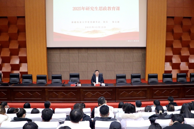 12月18日,新疆农业大学党委副书记、校长郑文新围绕“筑强农之基,兴边疆之业”,为2025级研究生讲授思政教育课。研究生院院长石书兵主持。本次思政课采取线上线下相结合的方式开展,覆盖2025级1951名硕士研究生和159名博士研究生。