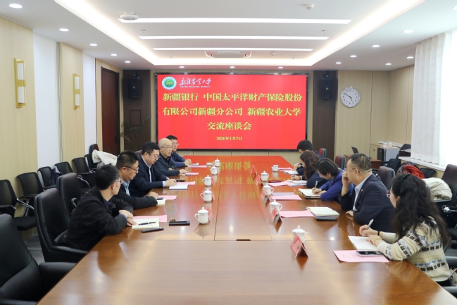 1月7日,新疆农业大学党委副书记、校长郑文新与新疆银行、中国太平洋财产保险股份有限公司新疆分公司交流座谈,围绕服务“三农”、发挥高校科技与人才优势、深化农业保险协同创新、服务新疆畜牧业和现代农业高质量发展等内容展开深入交流。