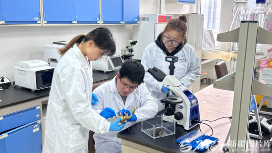 1月29日,在新疆农业大学动物医学学院实验室,新疆吉木乃窄螯螯虾科技小院师生正在观察螯虾性腺组织切片。张格摄