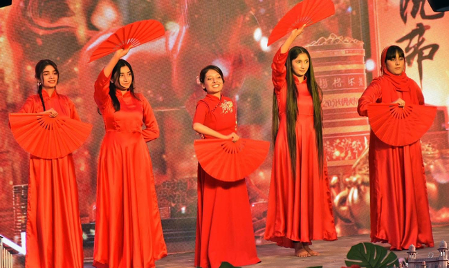 庆祝活动中,孔院学生的中巴歌曲、中国传统扇子舞、太极表演、中巴传统服饰展示以及趣味“筷子挑战”等精彩节目,现场气氛热烈,掌声不断。师生们在孔院广场举行了烟花燃放和孔明灯放飞仪式,充分展现了两国文化的多样性与交融。