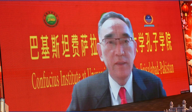 中国驻拉合尔总领馆政新处代理主任李浩腾通过视频向活动致以热烈祝贺。他表示,尽管无法亲临现场,但心与大家同在,并指出:“费萨孔院不仅仅是学院,更是友谊的家园。新疆农业大学在其中付出的努力和心血,为这座友谊之桥的稳固奠定了坚实基础。”他期待未来在青年交流、农业科技等领域开展更多合作,并祝愿中巴友谊万古长青。