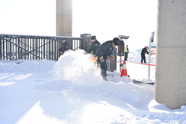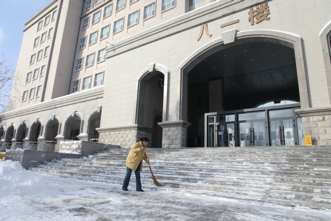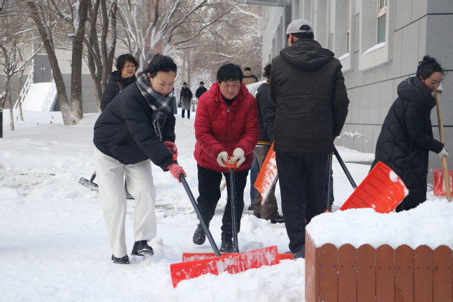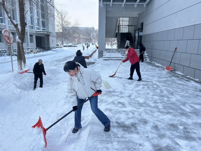 森林老师发来照片的时候,教学楼前的清雪车已经轰鸣了一夜。镜头里,物业师傅手里的铁锹却一刻没停。他们身后的台阶,一级一级露出原本的颜色。保安大哥站在路口的积雪里,挥手引导着早起的同学:“慢一点,走这边清好的路,那边雪还没清完。”