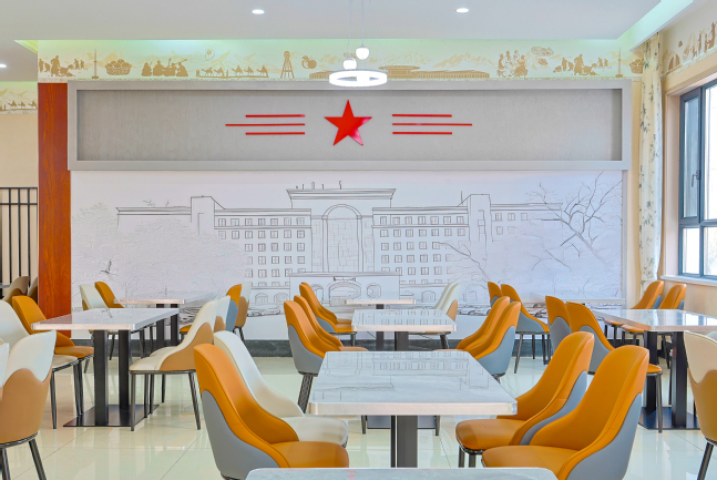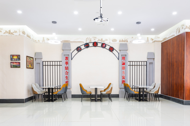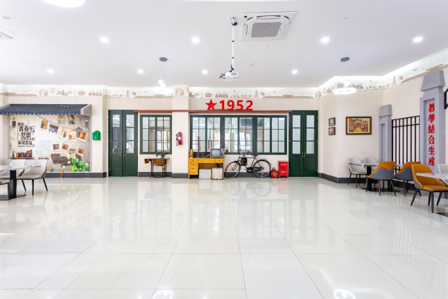 复刻的建校初期校门就立在餐厅最醒目的位置,朱红色的门楣上还留着当年的校名题字,当你看向这座大门,仿佛下一秒就能看见1952年第一批背着行囊入校的青年。门柱上“理论联系实际,教学结合生产”的办学方针,依旧清晰如昨,那是母校教给我们的第一课。