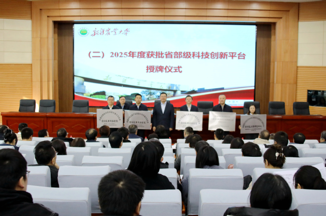 会议通报了学校“十四五”科技指标完成情况,宣读了2025年度“十大科技进展”和“十大科技应用成果”评选结果。郑文新为2025年度获批的自治区重点实验室、农业农村部野外科学观测研究站、自治区发改委工程研究中心等省部级科技创新平台授牌;为入选自治区人才支持计划的代表颁发证书。动物医学学院、公共管理学院(法学院)、机电工程学院(新能源学院)负责人分别作交流发言。