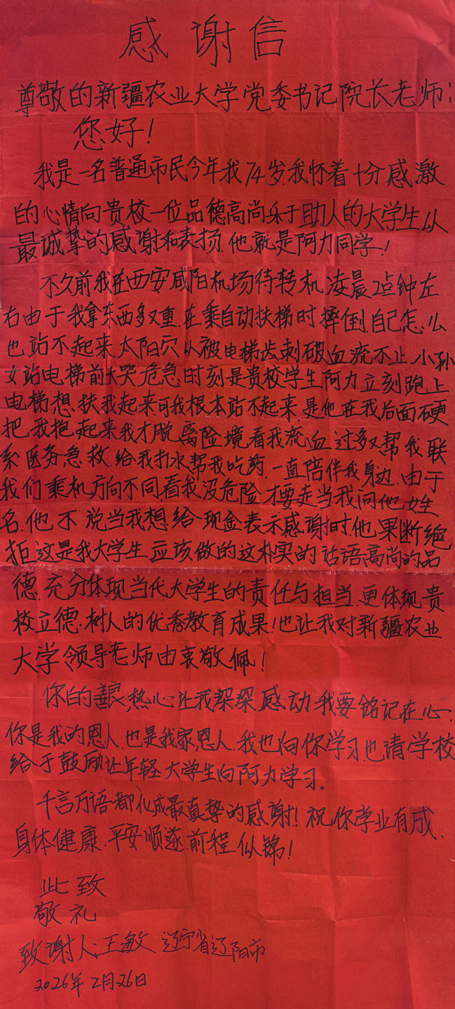 老人记住了“新疆农业大学”六个字,回到辽宁后,她时常想起这个个子不高,眼睛大大的小伙子,思索良久,她提笔写下了一封感谢信,挂号寄给了新疆农业大学。