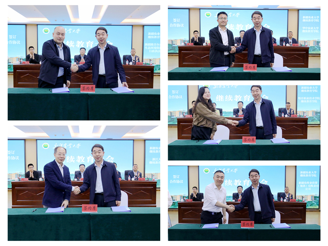 会议期间,新疆农业大学继续教育学院与新疆维吾尔自治区生态环境保护综合行政执法局、浙江大学继续教育学院、华中农业大学继续教育学院、喀什职业技术学院、新疆农牧业投资(集团)有限责任公司等单位签署合作框架协议或校外教学点合作协议,涵盖人才培养、课程共建、师资共享、基地建设等领域。
