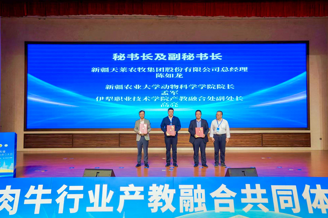 为深入贯彻落实国家产教融合战略,推动肉牛产业高质量发展,4月12日至13日,全国肉牛行业产教融合共同体成立大会在新疆伊宁市举行。大会以“融通产教深脉·赋能肉牛产业·服务国家战略”为主题,由新疆维吾尔自治区畜牧兽医学会主办,新疆天莱农牧集团股份有限公司、新疆农业大学、伊犁职业技术学院共同发起并承办。来自政府主管部门、行业学会、科研机构、高等院校、职业院校及肉牛产业链上下游企业的200余名代表齐聚一堂,共同见证我国肉牛产业与职业教育深度融合的重要时刻。