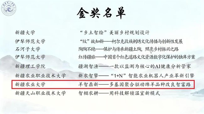 10月19日,新疆维吾尔自治区第四届大学生乡村振兴创意大赛决赛在新疆理工学院落下帷幕,新疆农业大学学子荣获金奖1项,银奖4项,铜奖7项的好成绩。由张萍同学主持“羊智鼎新——多基因聚合驱动绵羊品种改良智富路”项目荣获金奖,动物科学学院朱梦婷、齐·阿拉达尔两位老师获得“优秀指导教师”称号,公共管理学院(法学院)张俊杰老师荣获“先进工作者”称号。新疆农业大学荣获“优秀组织单位”。