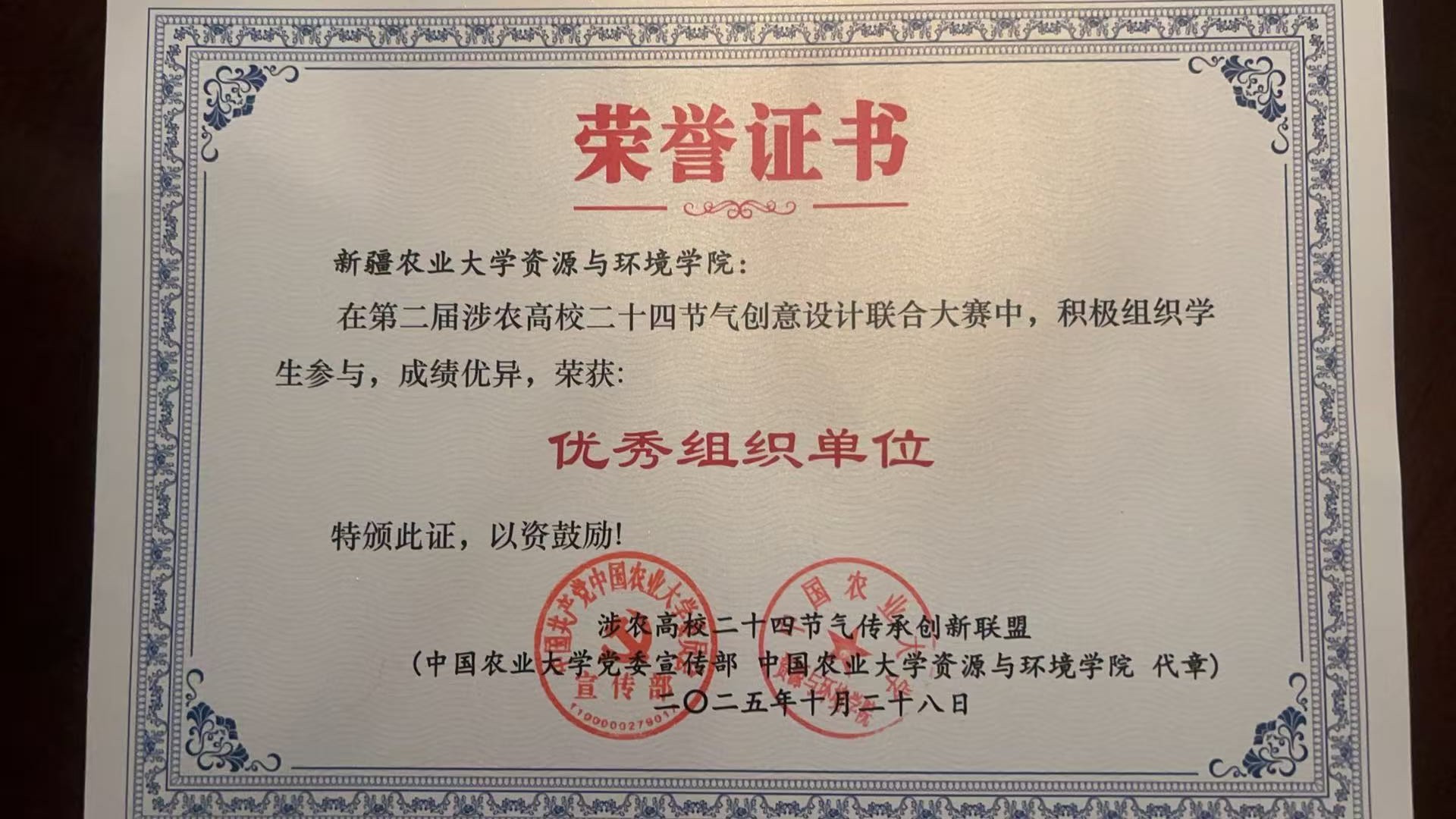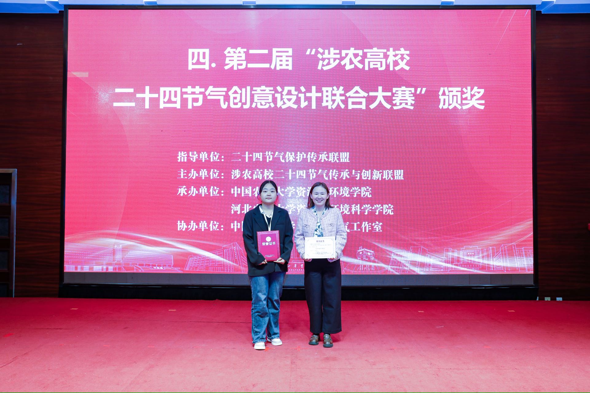 近日,第十八届全国农林高校资源环境类学院党建与思想政治工作研讨会在河北保定召开。会议期间,举办了第二届“涉农高校二十四节气创意设计联合大赛”颁奖典礼。资源与环境学院荣获“优秀组织单位”称号,选送的我校20份学生作品全部获奖,实现“满堂红”。