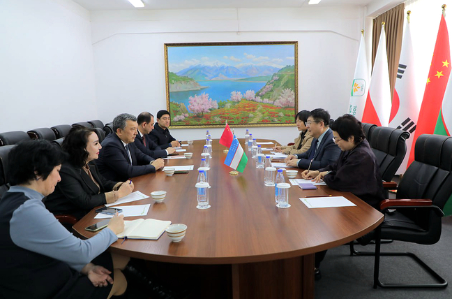 论坛期间,代表团专程到访塔什干国立农业大学,与该校校长奥布洛穆拉多夫·纳尔祖洛教授及相关部门负责人举行工作会谈。代表团还实地调研了学校与塔什干国立经济大学共建的“乌兹别克斯坦—中国教育与科学研究中心”,亲切慰问派驻该中心的我校马雪梅副教授。