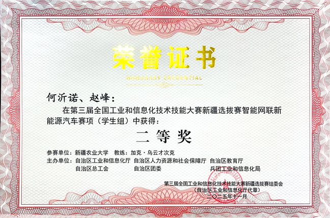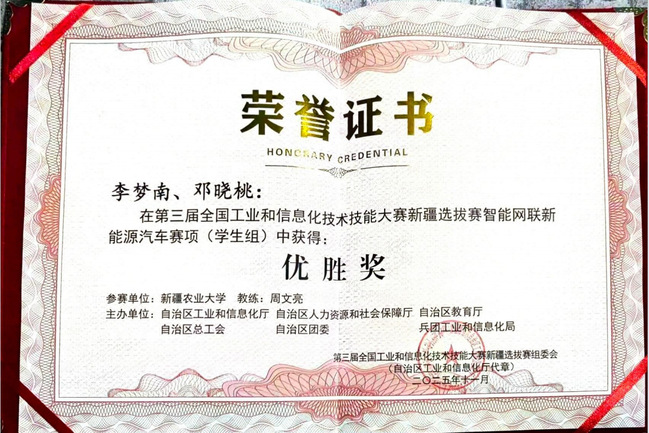 近日,2025年全国行业职业技能竞赛——第三届全国工业和信息化技术技能大赛智能网联新能源汽车赛项新疆选拔赛获奖名单公布,我校交通与物流工程学院学生何沂诺、赵峰获得新疆选拔赛二等奖;李梦南、邓晓桃获得优胜奖;指导教师加克·乌云才次克获优秀指导教师称号。
