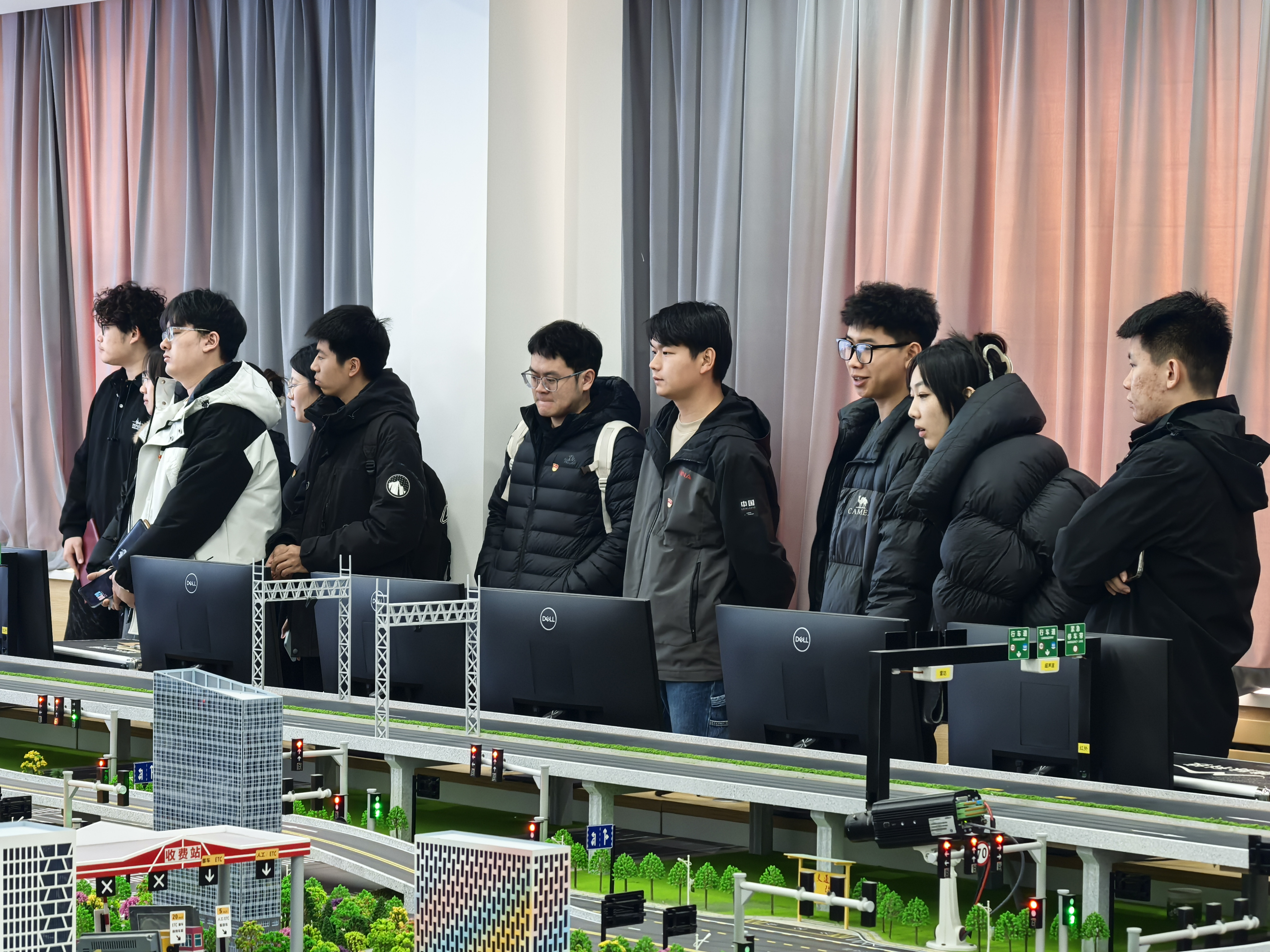全体党员参观了交通规划仿真实验室和智能交通实验室。交通与物流工程学院研究生李龙飞结合沙盘模型,详细讲解了城市路网规划与仿真系统的运行原理。参观过程中,大家体验了AGV小车智能调度模拟、交通信号灯协同控制实验等互动项目,近距离感受智能交通技术的科技魅力与创新实践。