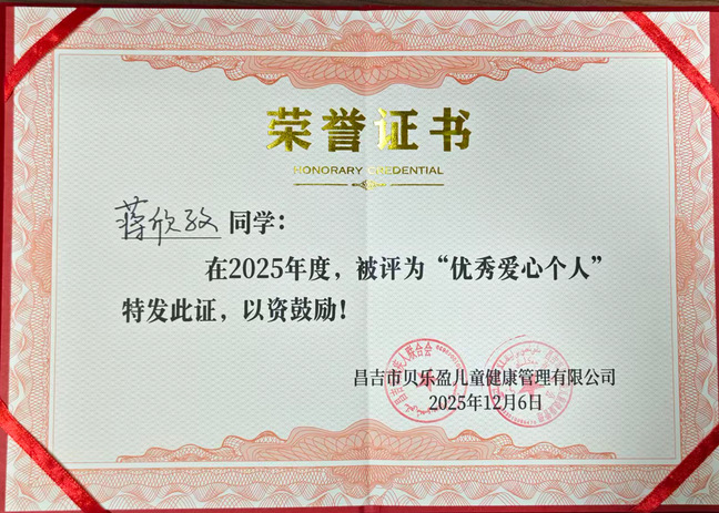 据了解,自2025年8月起,蒋欣孜利用暑期务工、周末兼职所得及部分家庭支持,持续向昌吉市贝乐盈康智园康复中心捐赠营养品、学习用品等物资,担任义工和助教,以实际行动关爱特殊儿童。其善举不仅为康复中心的日常运营提供了切实帮助,更给孩子们带去了精神上的温暖与鼓舞。